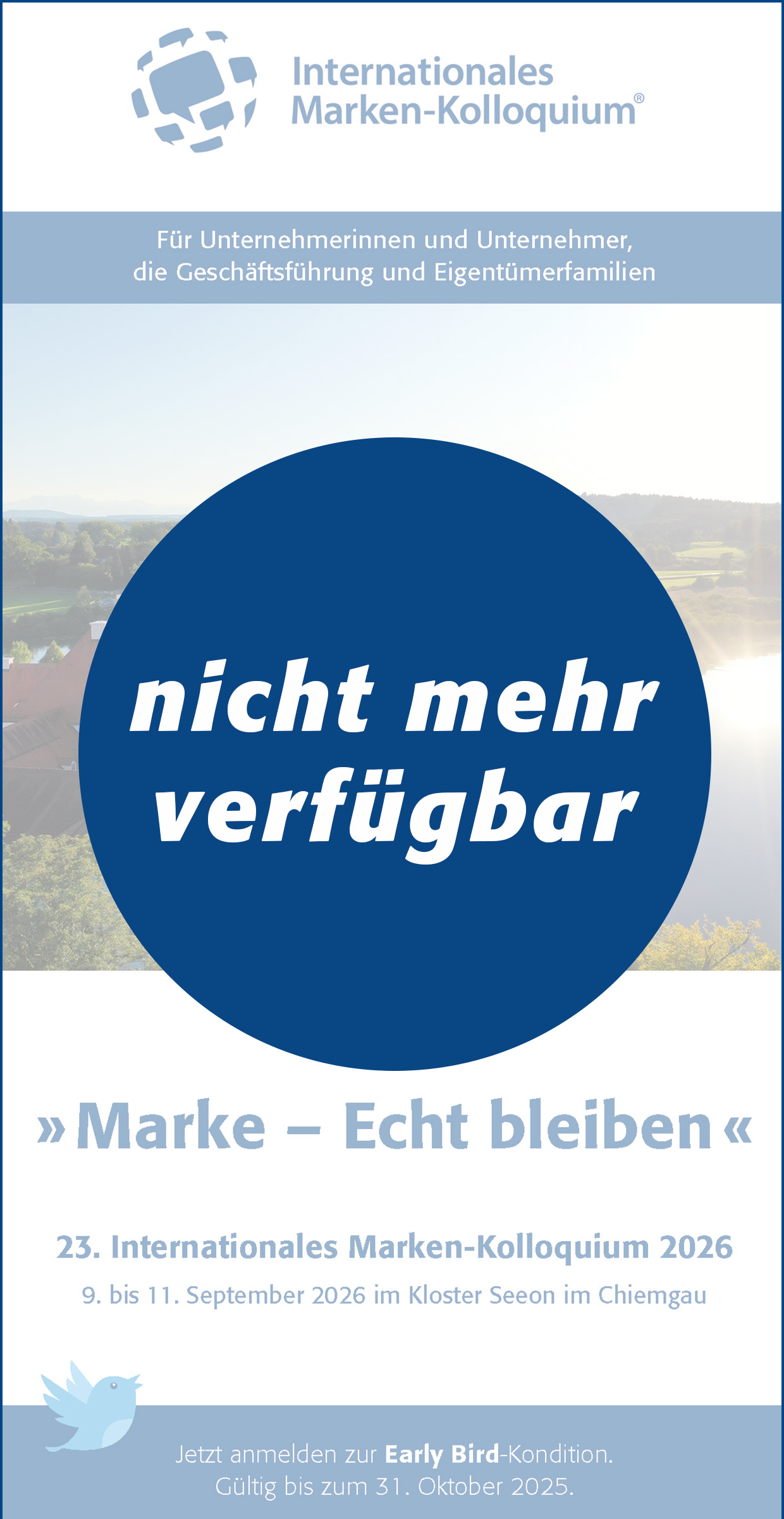 Wichtiger Hinweis: Mit Ihrer Teilnahme am Internationalen Marken-Kolloquium willigen Sie ein, dass wir Ihre personenbezogenen Daten zum Zwecke der Veranstaltungsdurchführung sowie zur Berichterstattung in der Presse und in den von Mandat eingesetzten Medien verarbeiten. Dazu zählen einerseits die Kontaktaufnahme vor und nach der Veranstaltung, die Veröffentlichung Ihres Namens, Ihrer Position sowie Ihres Unternehmens im Rahmen der Teilnehmerverzeichnisse vor Ort und das Erstellen von Fotos und Videos. Details zur Datenverarbeitung bei Mandat sind den Datenschutz-Hinweisen unter http://www.mandat.de/de/datenschutz/ zu entnehmen. Damit Sie auch über die nächsten Veranstaltungen informiert bleiben, werden wir Ihre Kontaktdaten dazu nutzen, Ihnen anlassbezogen Informationen zuzusenden. Sie können dieser Verwendung jederzeit kostenfrei widersprechen.